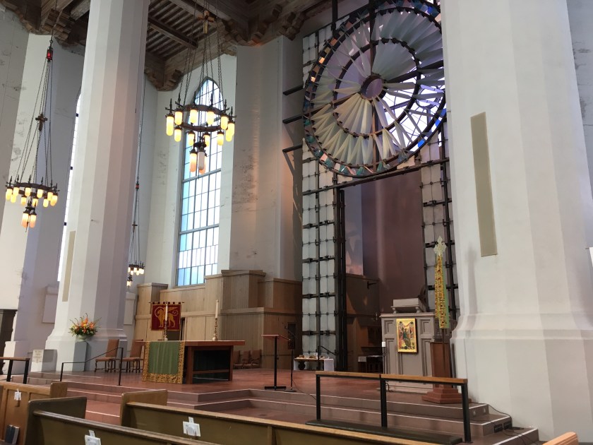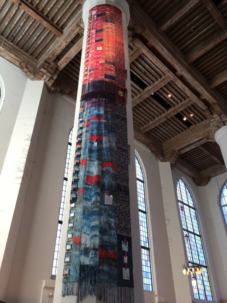 Hanging on one of the church pillars, it soars 50′ high. It is stunning. Two panels are dyed in bright reds, purples and blues. The piece expresses a commitment to gay pride, Woven into the hand dyed cotton, hemp, and gold lame are various artifacts intended to represent “gay shame”, in terms of the traumatic aspects of being gay so many young people feel. It is thought provoking, to say the least, and a reminder of how so many suffer so much for just being whom they are born to be.