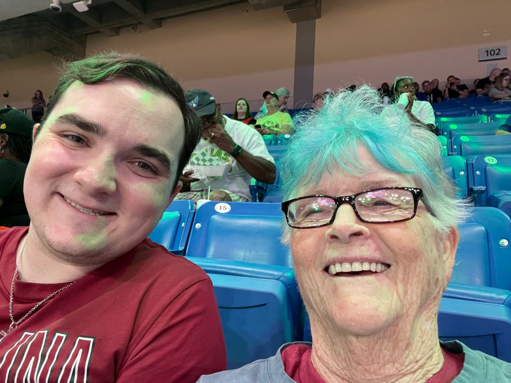 I loved being sandwiched by my grandkids while in the midst of sports excellence and passionate fans. A Happy time!