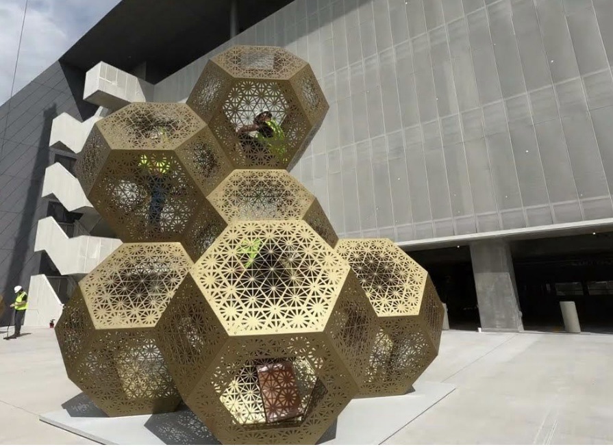 “Congruence is made up of 12 geometric forms. These are all truncated octahedrons, a special type of polyhedron that easily stacks together, leaving no gaps. The artwork includes a tall central structure and three individual shapes, revealing how the pieces fit together.”